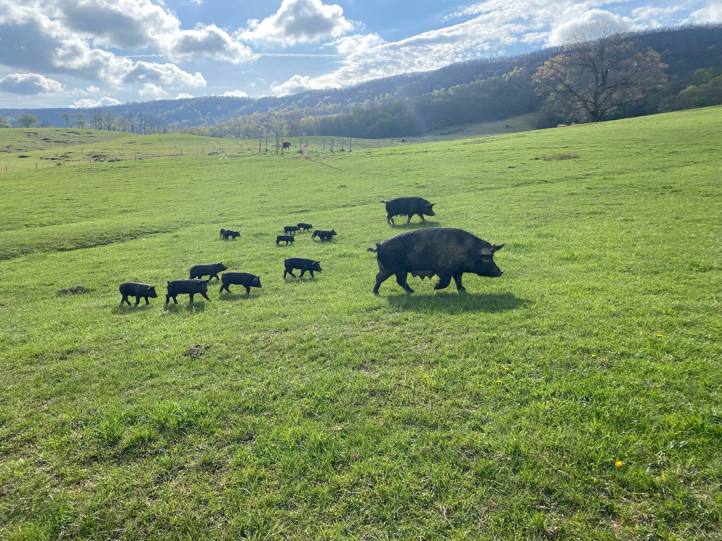 Our Mulefoots are hardy and excellent foragers. They thrive in our forested silvopasture setting that boasts large fall acorn crops and a generous mushroom bloom in the spring. The pigs live in the forest and forage on nuts, tubers, and grass depending on the season. (We do not ring their noses so that they can eat in accordance with their nature.) We supplement them with raw A2 milk from our Guernsey cows, fresh produce from the garden, watercress from our mountain spring, and a combination of grains and cracked-corn from a local Virginia farmer. The meat is dark, like the “red meat” that pork historically had been before industry took over.